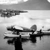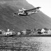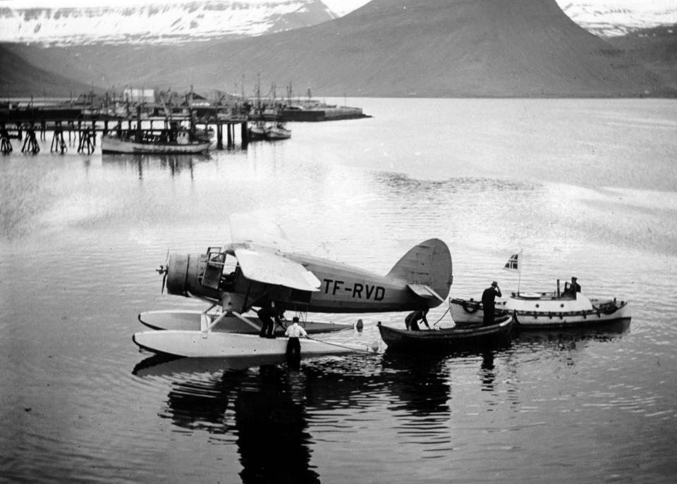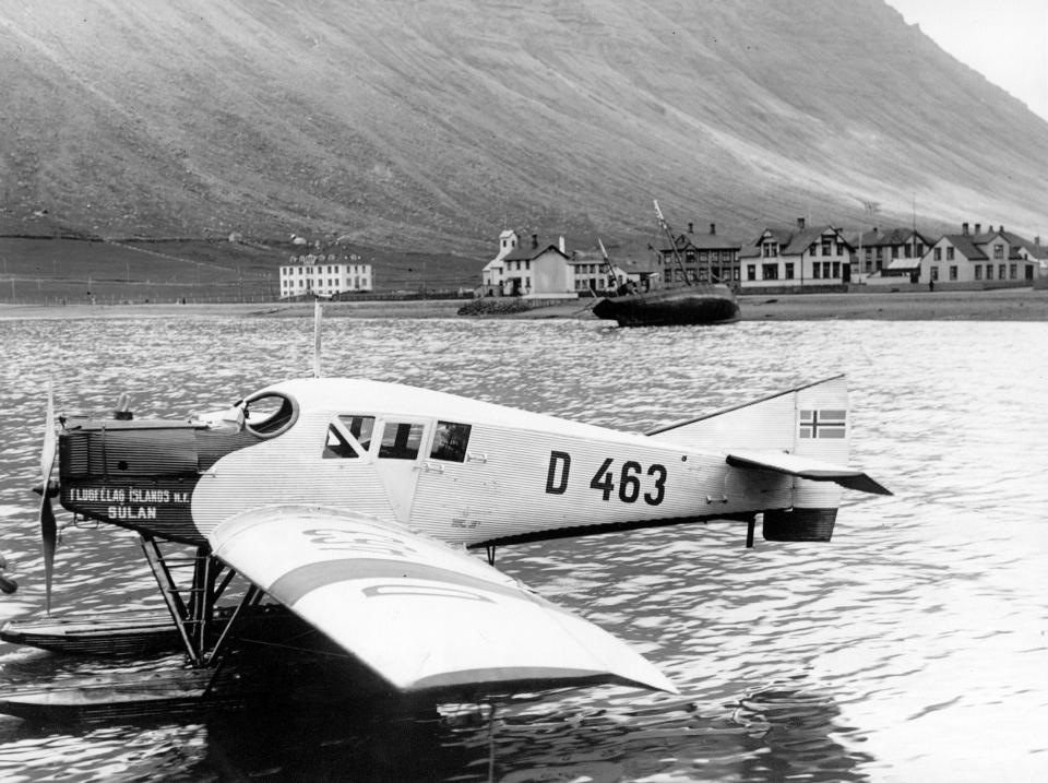 Some inhabitants in Ísafjörður would have been startled when an aircraft flew into the fjord and landed on the sea at Prestabugt, off the sandbar on 4 June 1928. The plane was called Súlan and it returned a month later for the first passenger flight to the West Fjords. In the year 1938 a new airline was founded at Akureyri which was later to become Flugfélag Íslands. It flew occasionally with passengers between Reykjavik and Ísafjörður during the following years and started scheduled flights in 1945 with a Catalina seaplane. Another airline, Loftleiðir, was however ahead in commencing scheduled flights to Ísafjörður in the year 1944, with a Stinson seaplane and later with Grumman seaplanes. Seaplanes normally landed in the natural harbour called Pollurinn and were beached at Hafnarstræti, or passengers were ferried by boat to Bæjarbryggjan jetty.